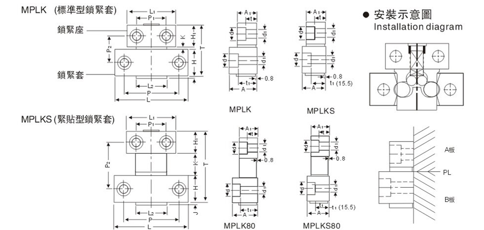 | MPLKS (緊貼型鎖緊套) | 30 | 65 | 46 | 35 | 48.5 | 25 | 20 | 35 | 3.5 | 50 | 31 | 26 | 24 | 19 | 9.5 | 15.5 | 11 | 7 | 150 |