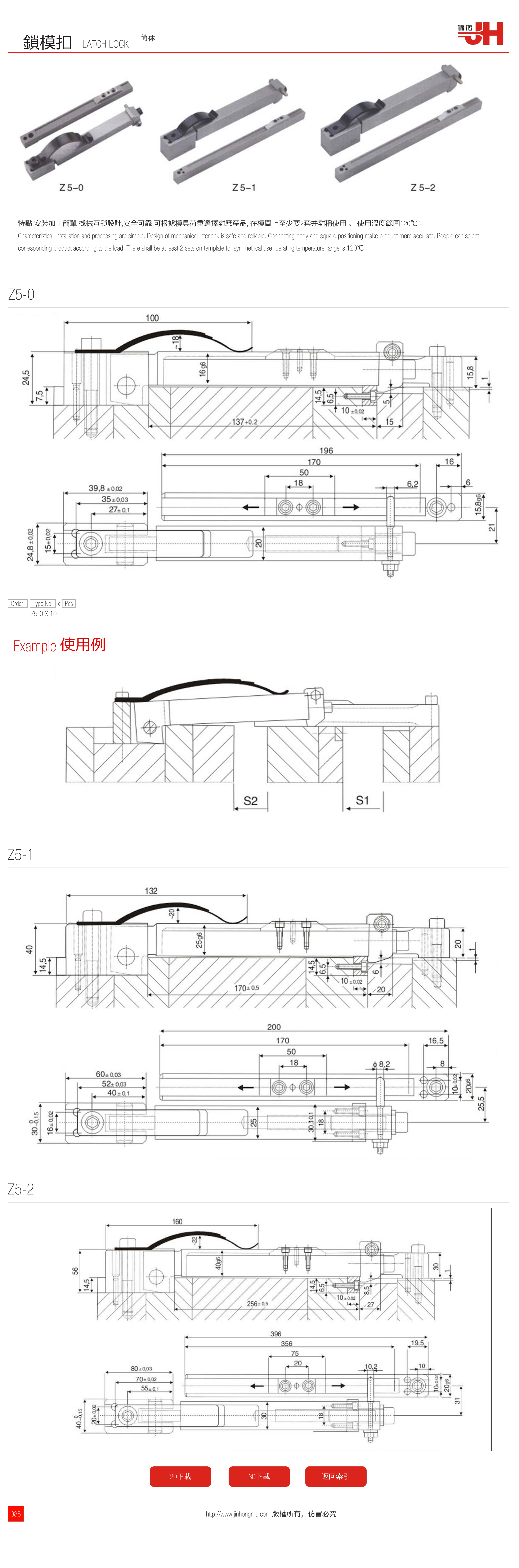 特點:安裝加工簡單,機(jī)械互鎖設(shè)計,安全可靠,可根據(jù)模具荷重選擇對應(yīng)産品,