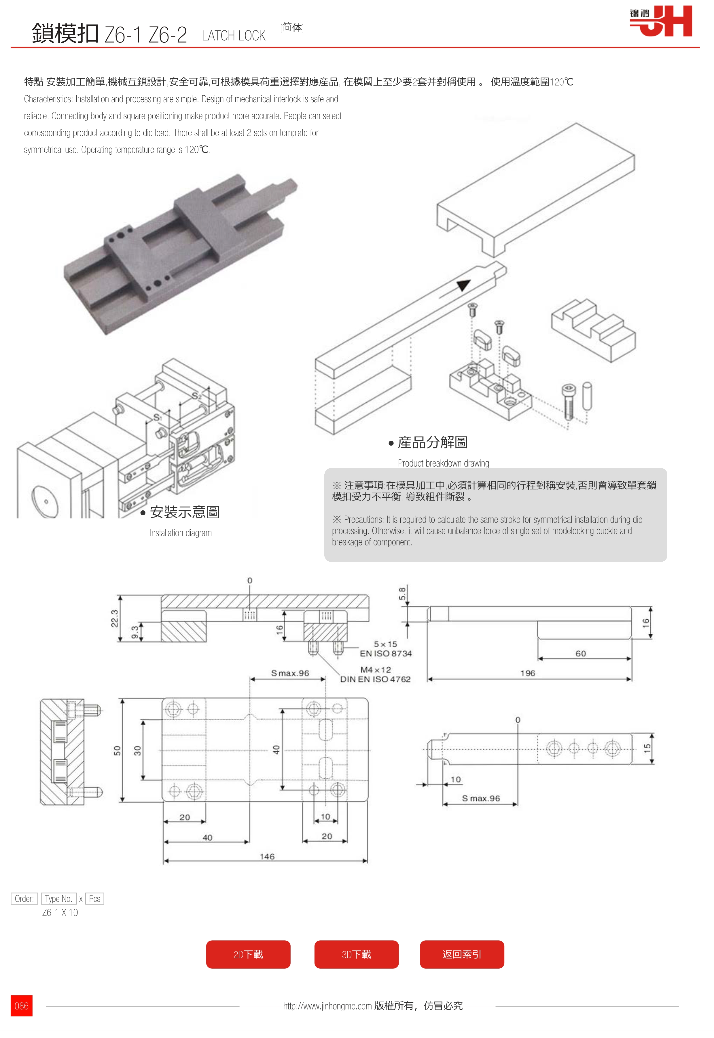 ※ 注意事項:在模具加工中,必須計算相同的行程對稱安裝,否則會導致單套鎖模扣受力不平衡, 導致組件斷裂 。