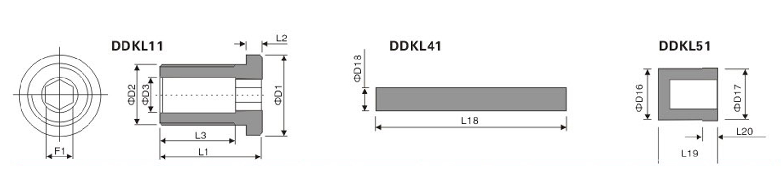 | 型號(hào) | 尺寸 | D1 | D2 | D3 | L1 | L2 | L3 | F1 | 型號(hào) | 尺寸 | D15 | L18 | 型號(hào) | 尺寸 | D16 | D17 | L19 | L20 |