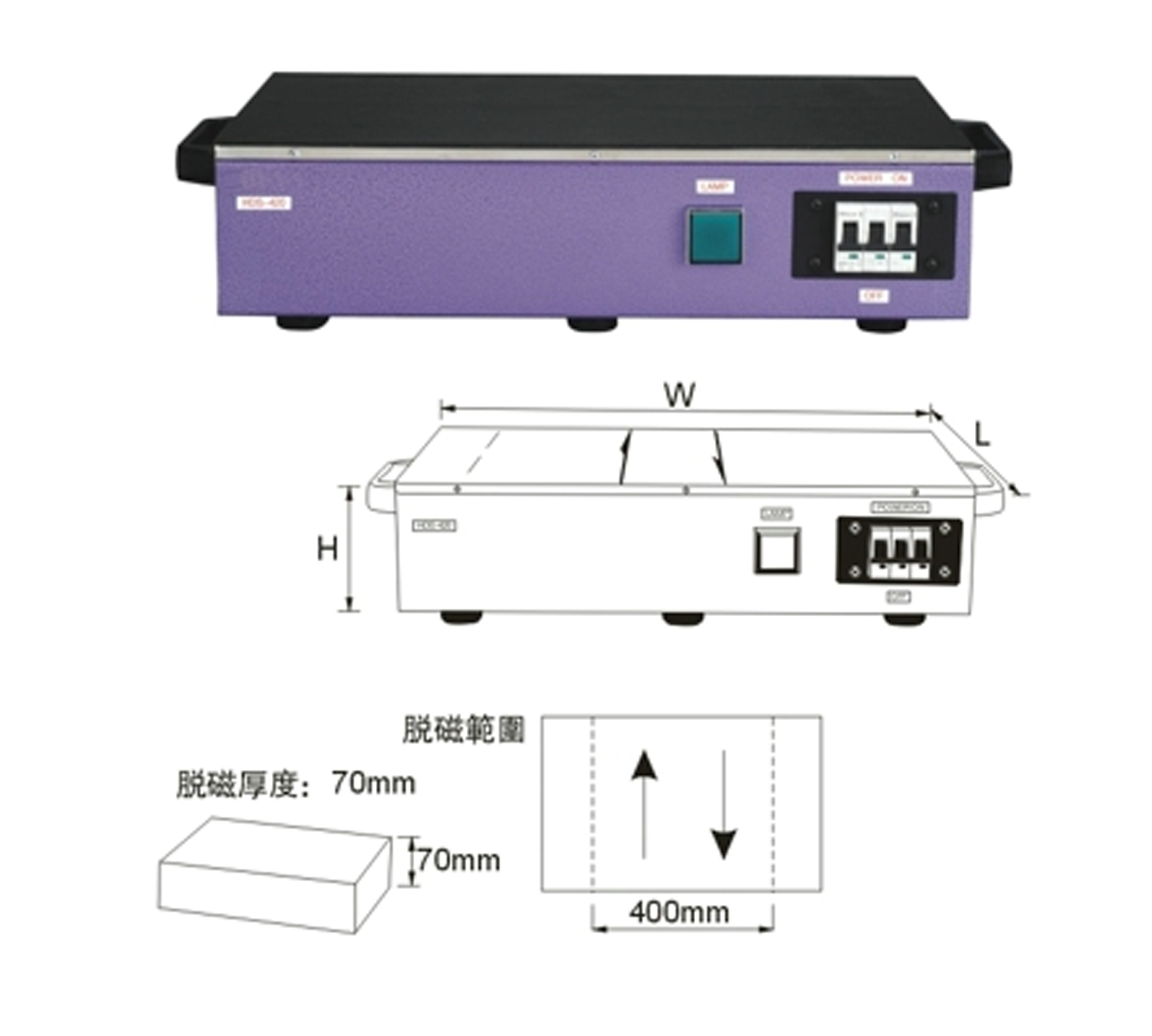 脫磁有效範(fàn)圍400mm(16”),脫磁工件有效厚度70mm