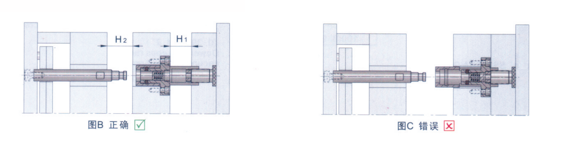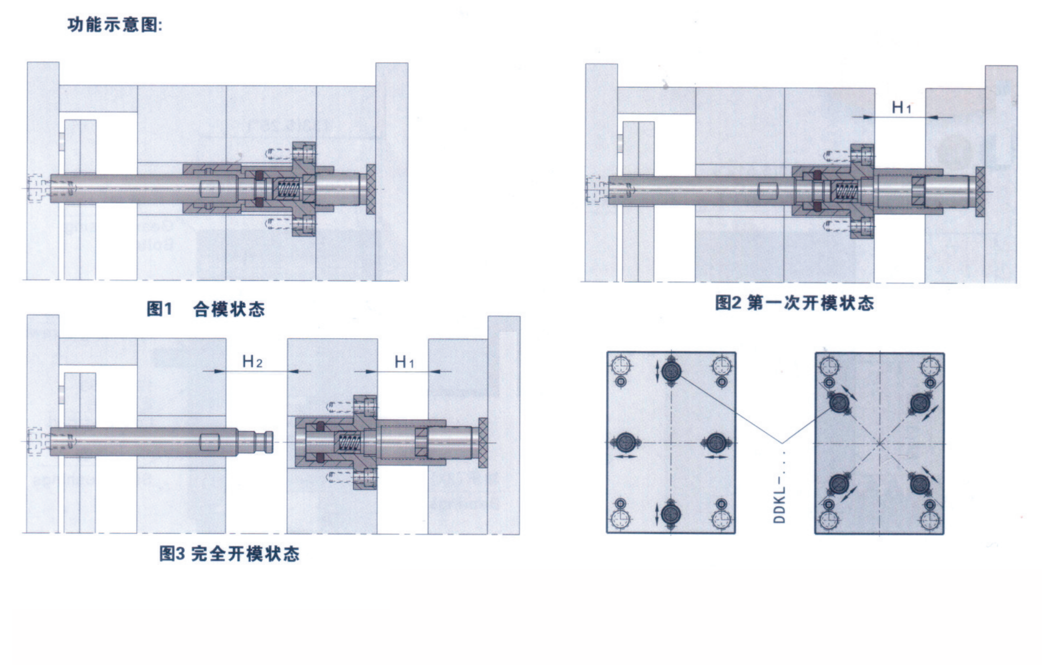 如下圖所示:當(dāng)插桿完全拔離活塞(第二次開模開始打開或完全打開)狀態(tài)下, 必須保證第一次開模行程處于完全打開狀態(tài),否則將會導(dǎo)致合模過程中,因插桿無法插入而損壞內(nèi)鎖模扣。