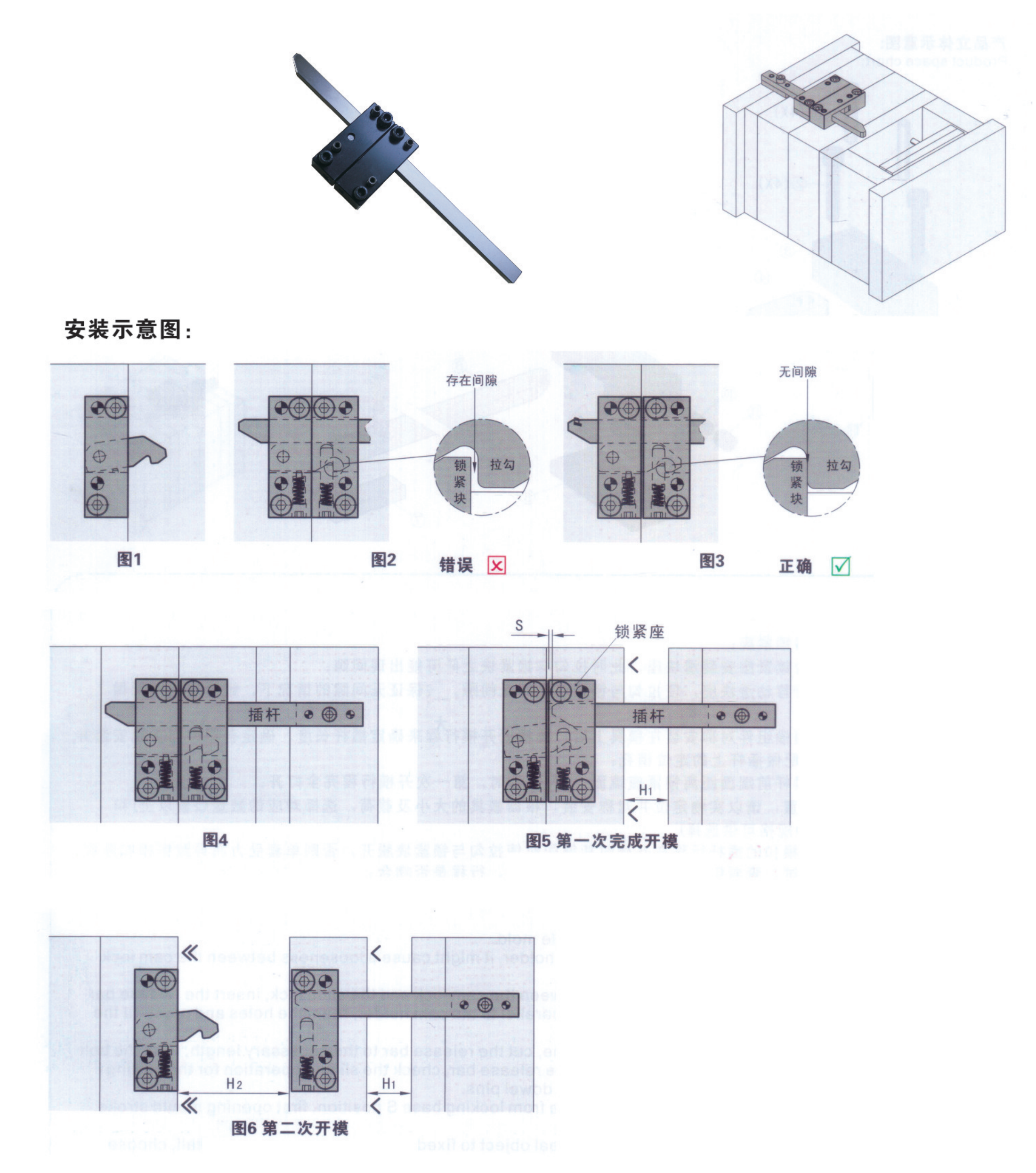 確保所有安裝鎖模扣的插桿行程在開模時能夠同時使拉勾與鎖緊塊脫開,否則單套受力將導致鎖??蹟嗔眩?/p>