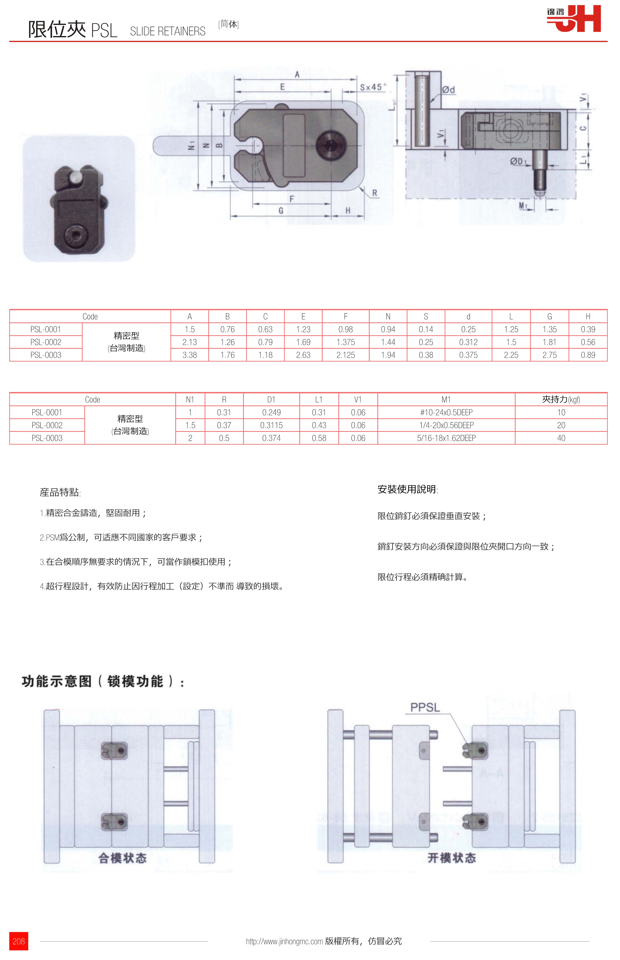 | PSL-0001 | 精密型 (臺灣制造) | 1 | 0.31 | 0.249 | 0.31 | 0.06 | #10-24x0.5DEEP | 10 |