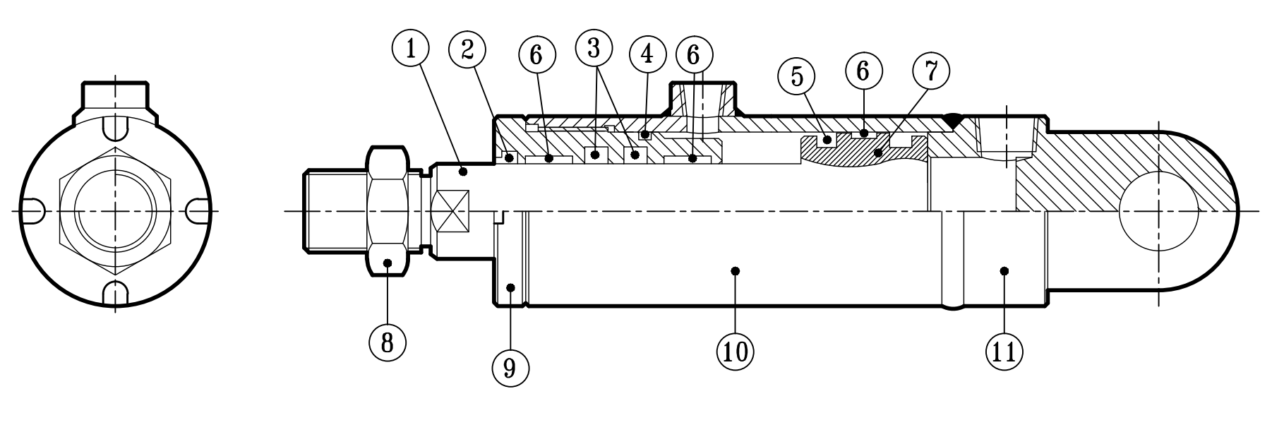 | 2 | 刮塵環(huán) Dust wiper | 1 | 6 | 導(dǎo)向環(huán) Wearing ring | 2 | 10 | 油缸本體 Cylinder tude | 1 |