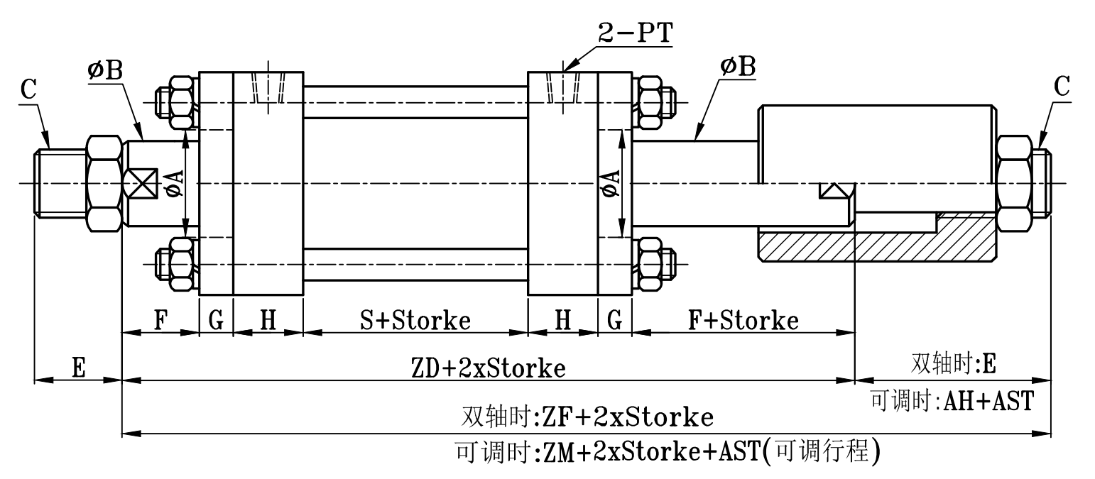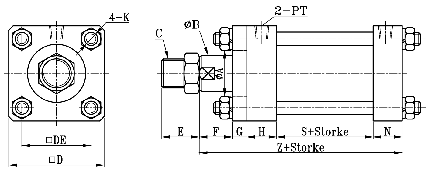 | 缸徑 BORE | ΦA(chǔ) | ΦB | □ D | □ DE | F | G | H | N | PT | K | S | Z | ZD | ZF | ZM | AH | C | E | J | JH | W | ΦV |