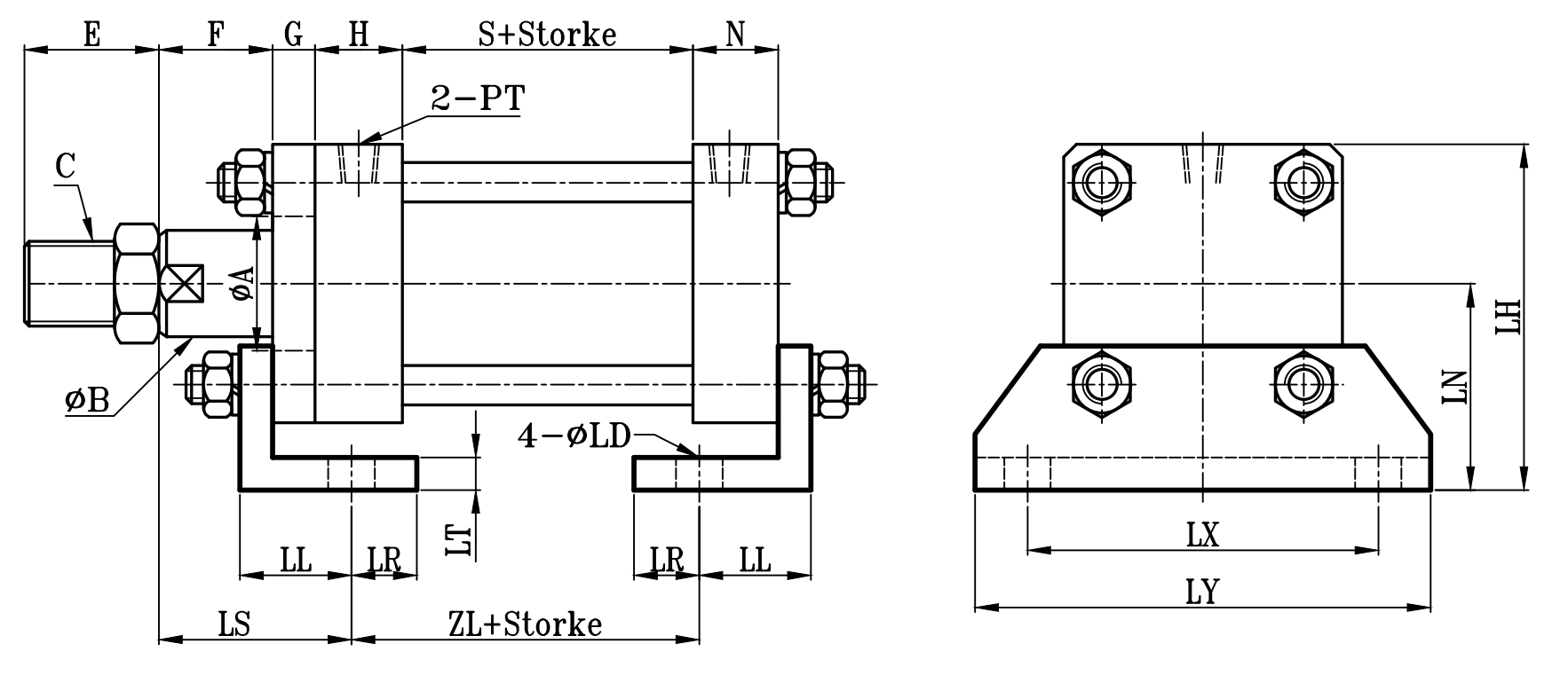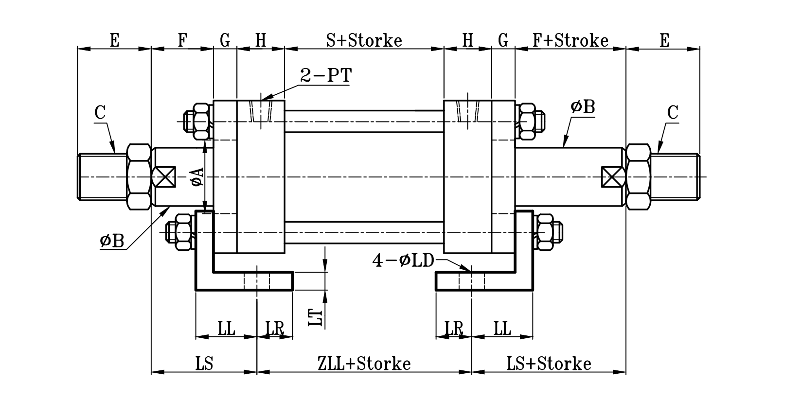 | 缸徑 BORE | ΦA(chǔ) | ΦB | C | E | F | G | H | N | PT | S | LS | ZL | ZLL | ΦLD | LH | LN | LL | LR | LT | LX | LY |