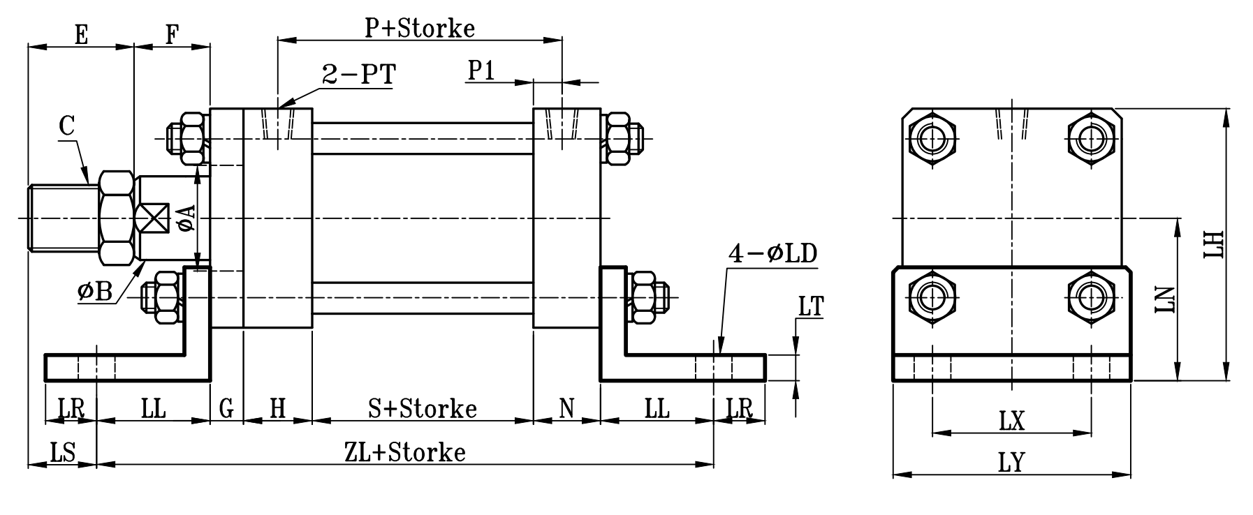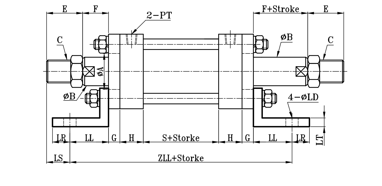 | 缸徑 BORE | ΦA(chǔ) | ΦB | C | E | F | G | H | N | P | P1 | PT | S | LS | ZL | ZLL | ΦLD | LH | LN | LL | LR | LT | LX | LY |