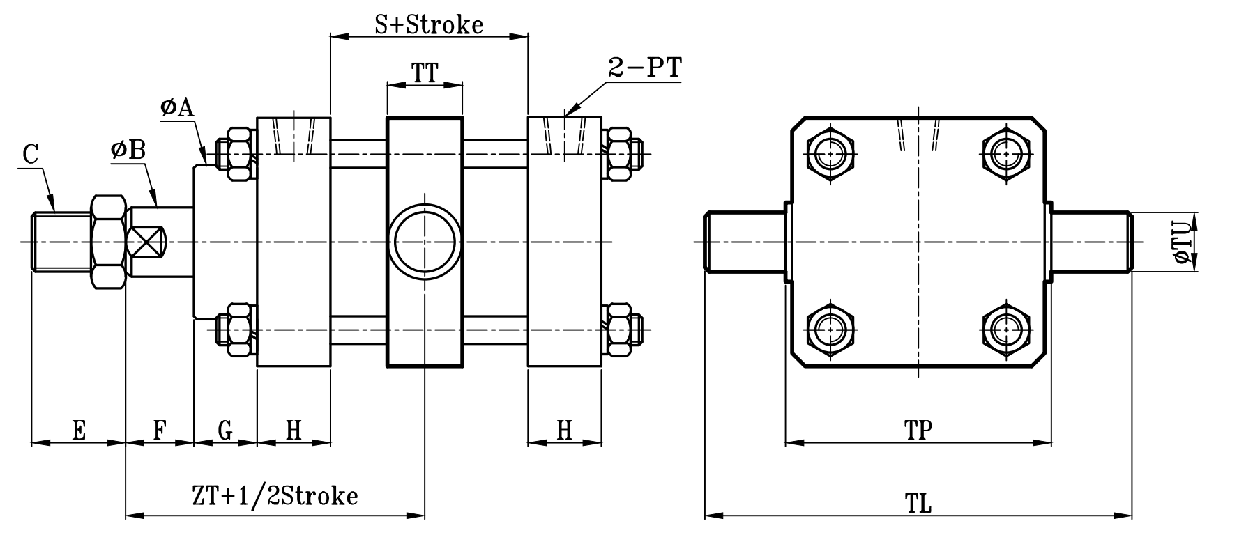 | 缸徑 BORE | ΦA(chǔ) | ΦB | C | E | F | G | H | PT | S | ZD | ZT | TL | TP | TT | ΦTU |
