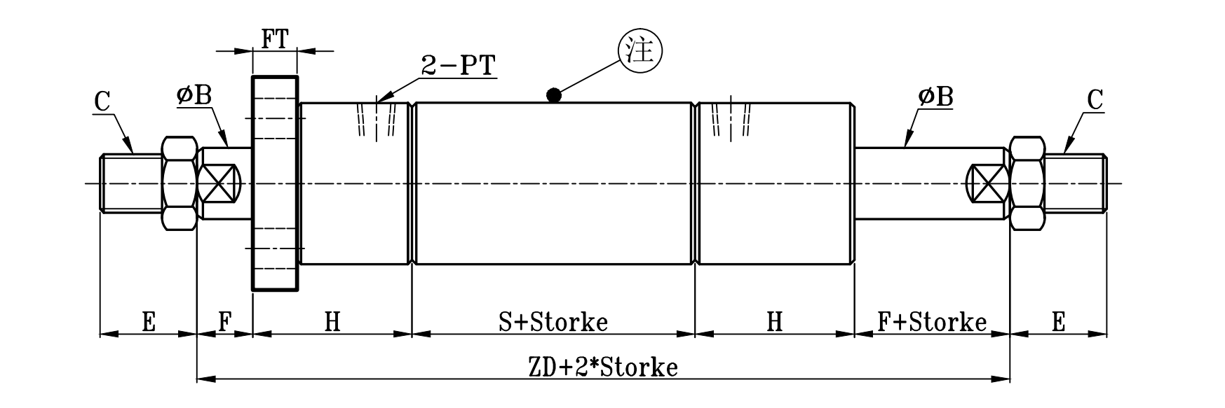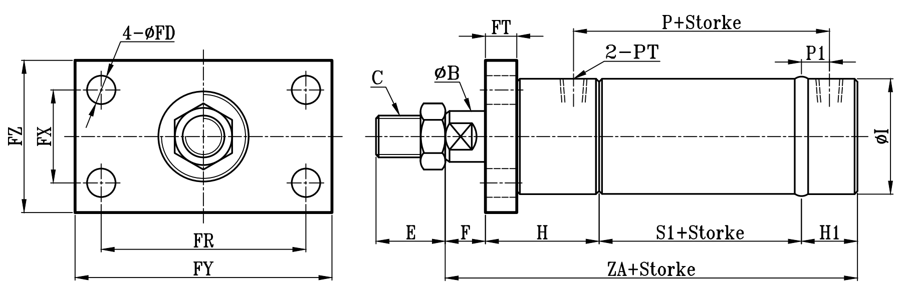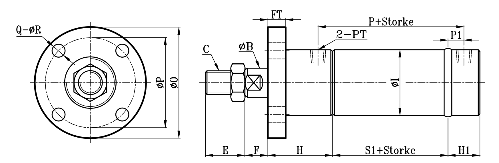 | 缸徑 BORE | ΦB | C | E | F | H1 | H | ΦI | P | P1 | PT | S1 | S | ZA | ZD | FT | ΦFD | FR | FX | FY | FZ | Q | ΦR | Φ0 | ΦP |