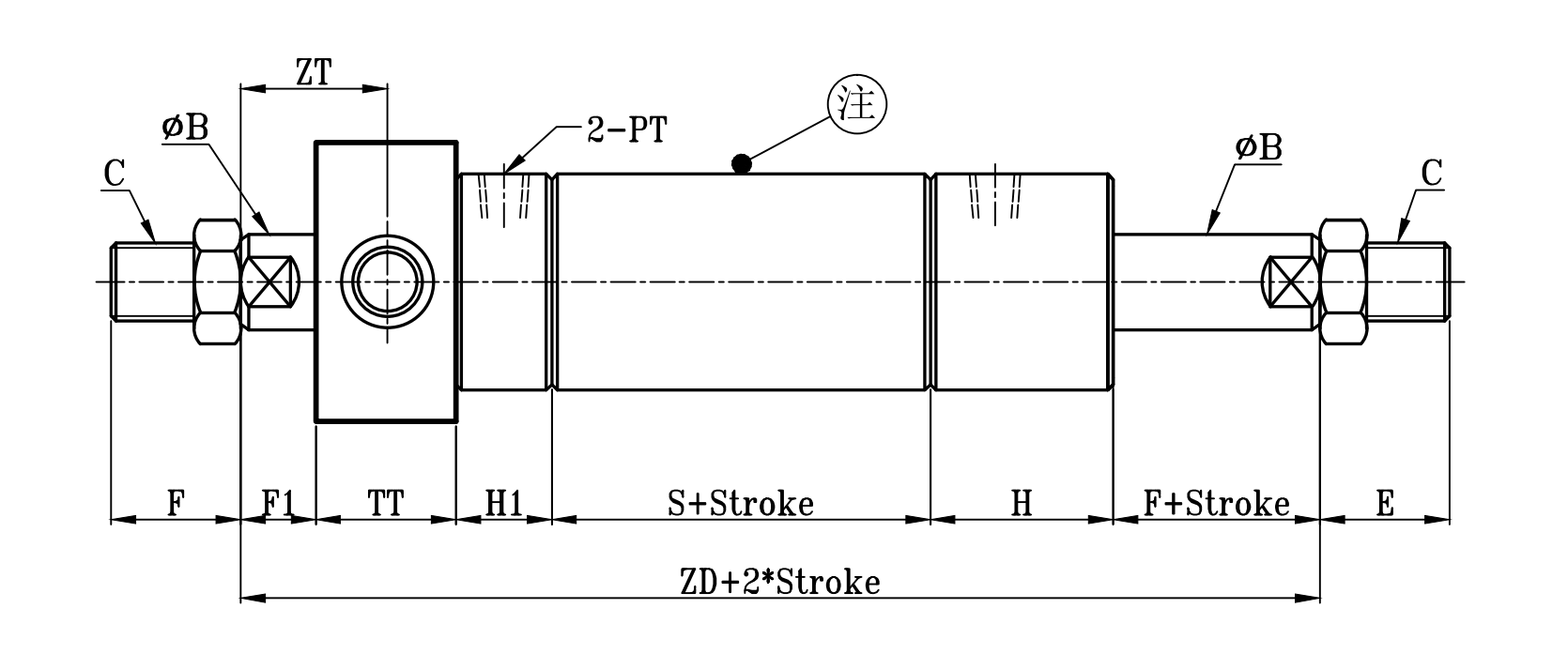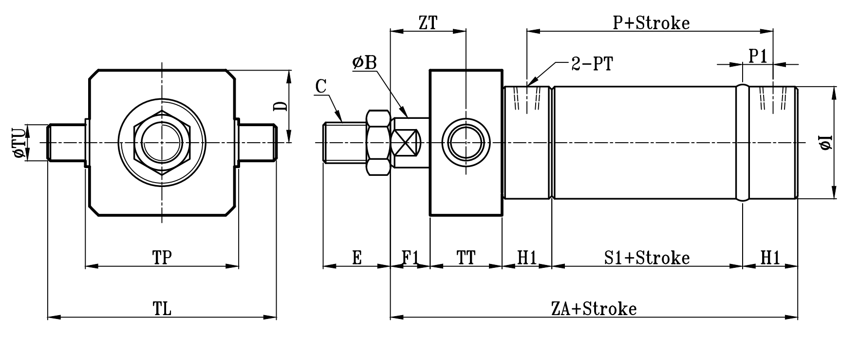 | 缸徑 BORE | ΦB | C | E | F | F1 | H1 | H | ΦI | P | P1 | PT | S1 | S | ZA | ZD | ZT | ΦTU | TL | TP | TT | D |
