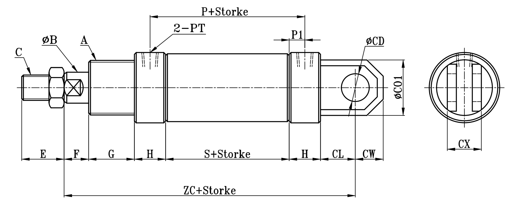 | 缸徑 BORE | A | ΦB | C | E | F | G | H | ΦI | P | P1 | PT | S | ZC | ΦCD | CL | CW | ΦCO | ΦCO1 | CV | CX |