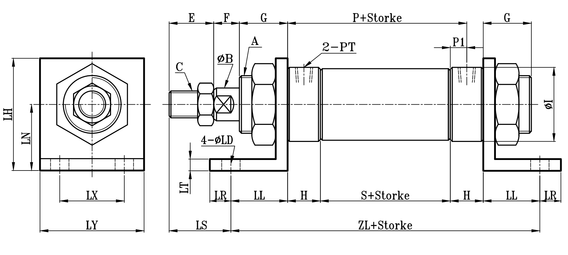 | 缸徑 BORE | A | ΦB | C | E | F | G | H | ΦI | P | P1 | PT | S | LS | ZL | ΦLD | LH | LN | LL | LR | LT | LX | LY |