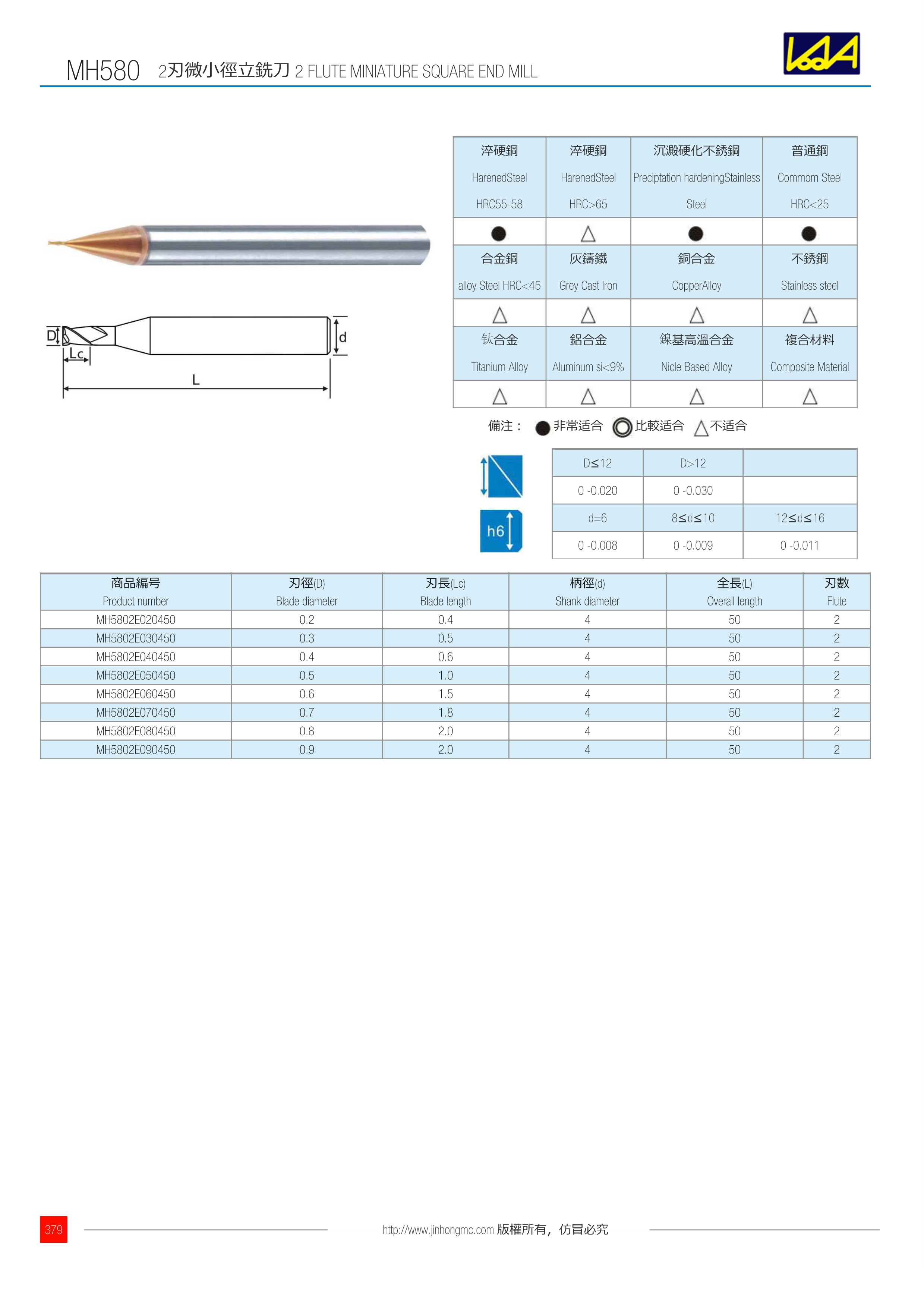 | 商品編號 Product number | 刃徑(D) Blade diameter | 刃長(Lc) Blade length | 柄徑(d) Shank diameter | 全長(L) Overall length | 刃數(shù) Flute |